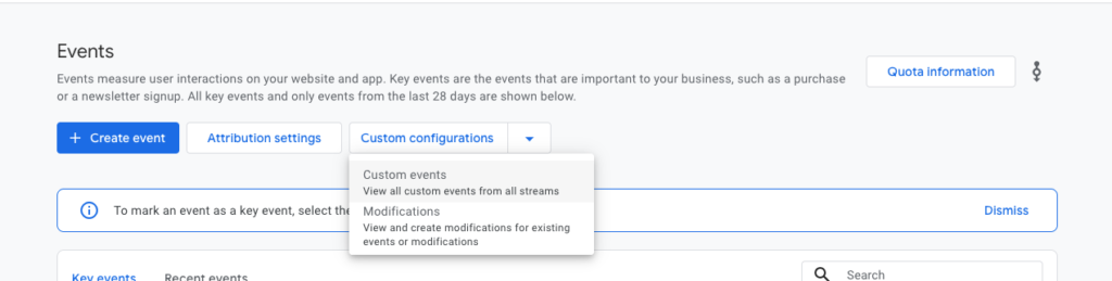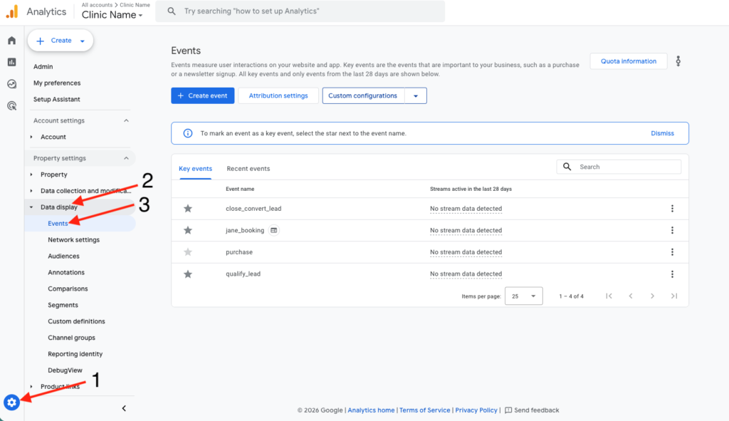 Key events (previously called conversions) tell GA4 which actions matter most to your practice. Open your GA4 property and go to Configure, then Events.