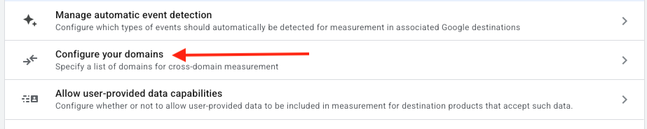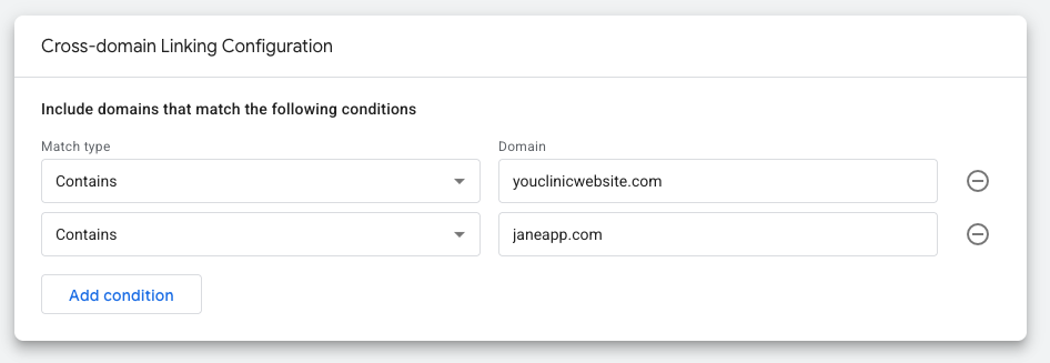 You’ll need to configure this in Google Tag Manager. Add your JaneApp domain to the cross-domain tracking field in your GA4 configuration tag. This typically includes your JaneApp subdomain (like booking.yourbusiness.janeapp.com).